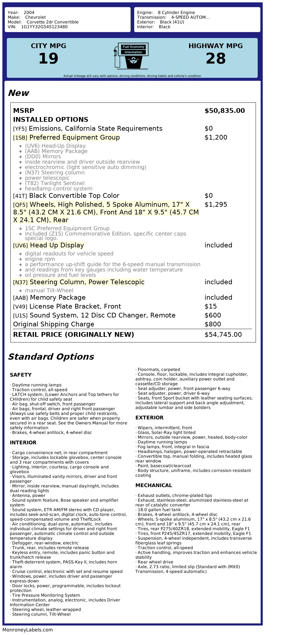 Get ready to turn heads and hit the open road in this sleek black 2004 Chevrolet Corvette! Packed with power and style, this Corvette is sure to impress with its aggressive front air dam, alloy wheels, and fog lights that cut through the mist. Slip into the leather seats, adjust your position with the multi-adjustable power seats, and set the perfect climate with separate controls. This Corvette is equipped with all the essentials like power windows, cruise control, and a trip computer to keep you on track.
